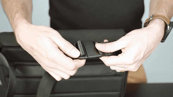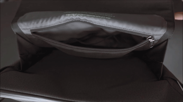 また、「日用品からカメラまで」・「ガジェット」を収納するコンパートメントはより強固に水に強いファスナーでの開閉が必要となりますが、ファスナーを締めた際に、持ち手部分をフラップ内に集めておくことで、ファスナーの不正開閉される可能性も減少します。