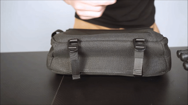 3つのコンパートメントへアクセスする際は必ずこのフラップを開閉しなければいけません。開閉の際はバッグ本体の体に密着する側(動画でいうと手前)に向いた側にフラップの開閉部があり、手前から奥にガバッと開く仕様となっております。
