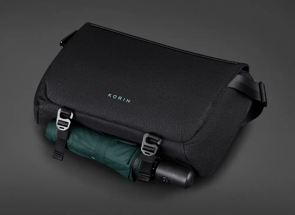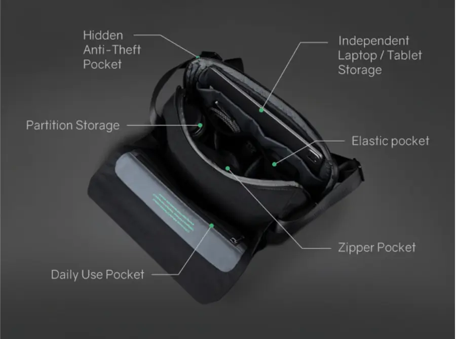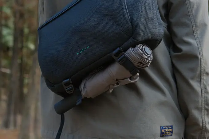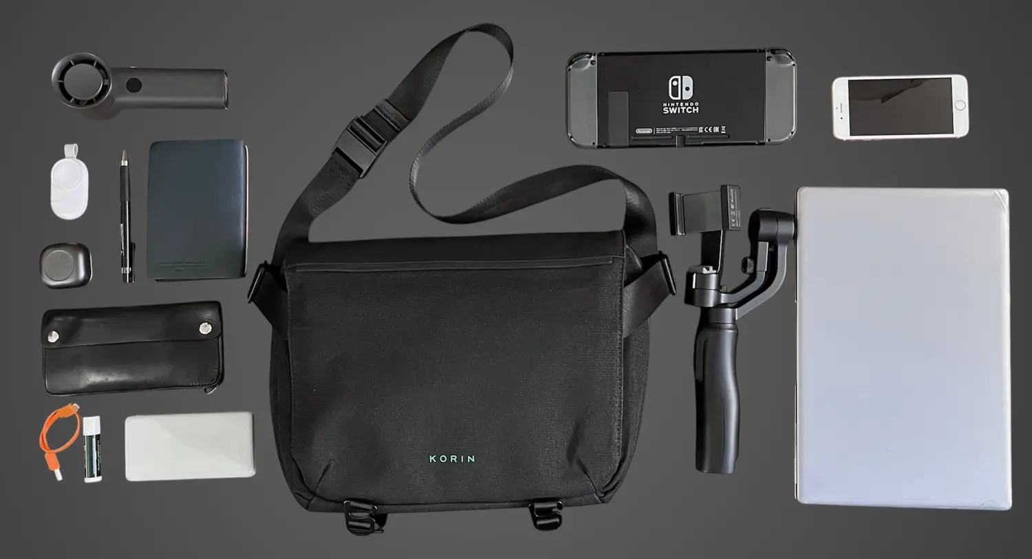 ①マグネット開閉式で日用品からカメラ・14インチPCまで収納。防犯スリング「HubSling X」